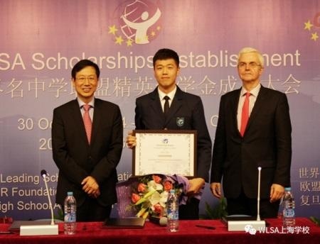 注:上图为2014年复旦附中时任校长郑方贤先生、英国伊顿公学前任校长 / WLSA上海(复旦)学校现任外方校长Tony Little先生为WLSA奖学金获得者闫呼和颁发奖学金