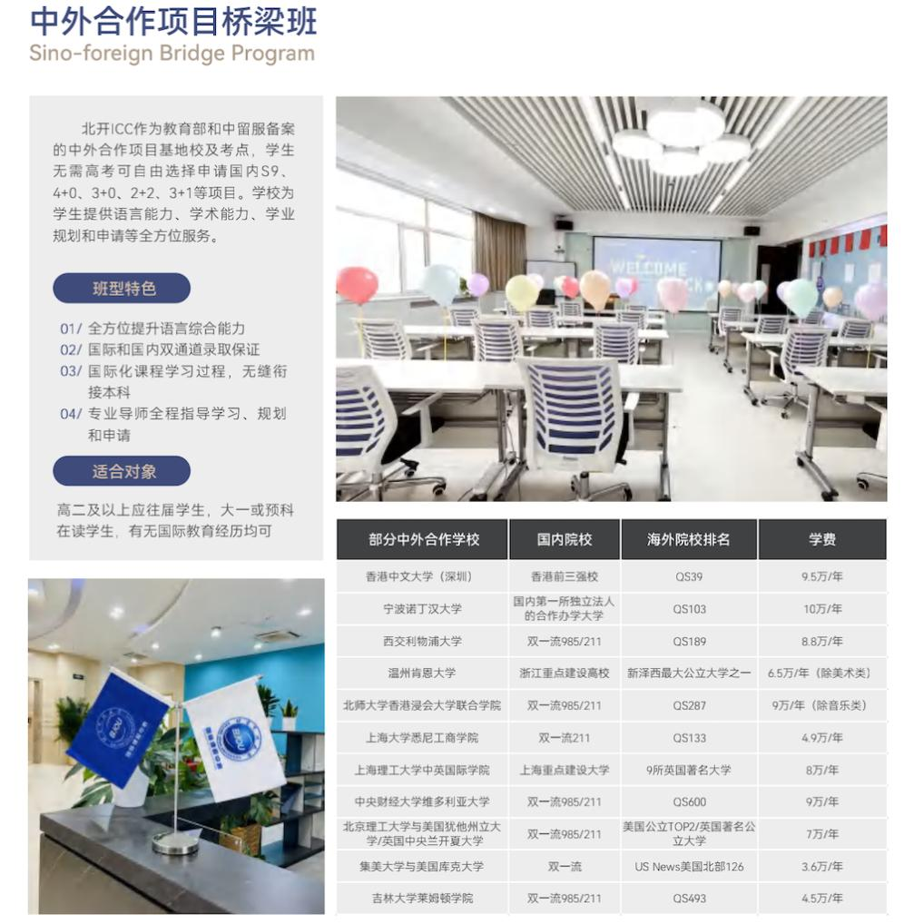 北开ICC全球英语牛校班可以选择OSSD、A-LEVEL两种课程,同时开设不同阶段的语言综合素养课程以及学术衔接提升课程,无论是普高班或国际班在读学生,还是已经入读大一或预 科预备的学生,都可以通过北开ICC灵活多样的选课和分层教学机制,来满足不同语言和学科基础的学生个性化发展需求。在北开ICC就读期间,学生可享受丰富的艺体品格教育课程,更有博士导师团队指导学生参加相关国际科研竞赛,提前进行高端背景提升,提高个人竞争力。高质量的生涯规划体系课程,可使学生更好地进行学业规划和申请准备,有条不紊地冲击世界梦校。