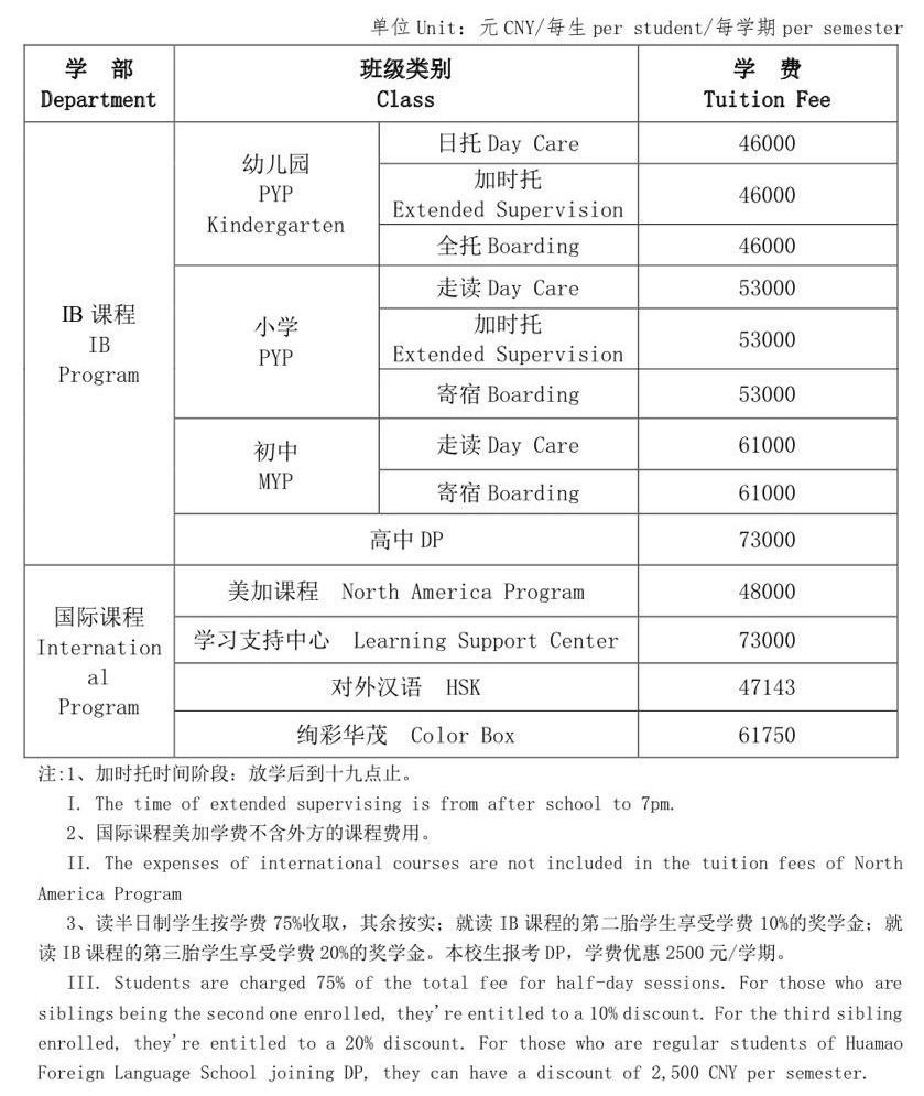 DP课程是一项以严谨的学术要求而著称的两年制课程体系,在全球大学范围内享有很高声誉。任何想要进入此课程体系的学生都必须提供以前的成绩报告和英语能力,优秀者需要雅思5.0分或者托福500分(机考61分),课程顾问会帮助学生进行选科和普通水平/高水平的选课。来自IB初中体系的学生达到IB 3分可选普通水平,达到5分或以上可选高水平。为了帮助学生成功申请大学,学生在11年级入学的个月内需正式进入选课课程学习。一旦进入,所有学生都需参加IB全科的学习,若11年级读完觉得自己无法完成全科,则可进行单科的学习。 往年学费介绍