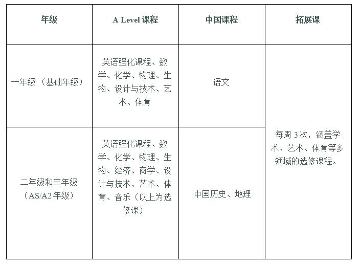 英语、数学、物理、化学、生物、商学/经济学(Business Studies/Economics)、艺术(Art)、设计与技术(Design Technology)