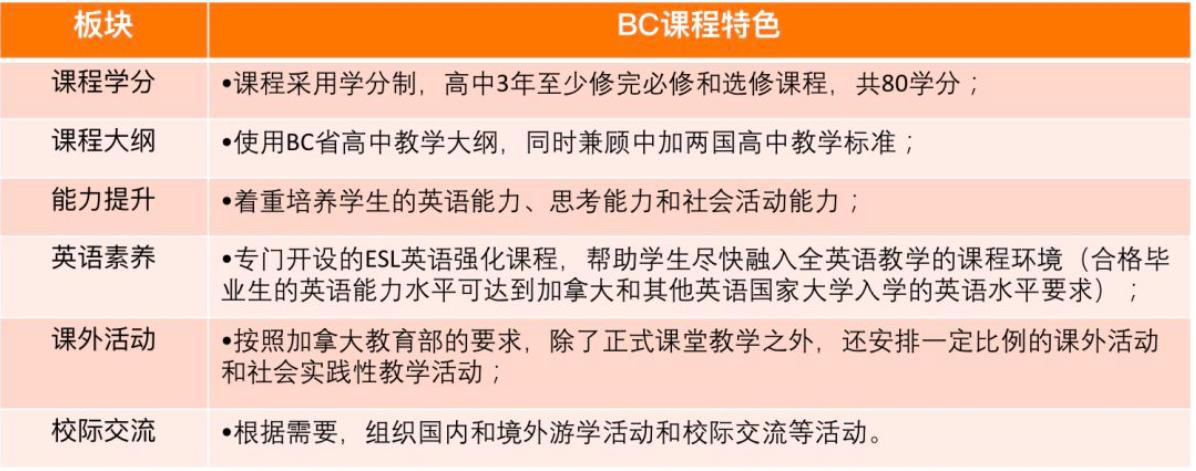 (注: 学业时间视学生注册课程时的英语水平而定。学生必须修满至少80学分的BC省课程。必修课每门课4个学分,必须达到50%及格分通过一门课程,取得学分;选修课程每门至少得到50%及格分来获取学分,方可成功获得BC省高中毕业证。)