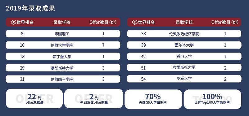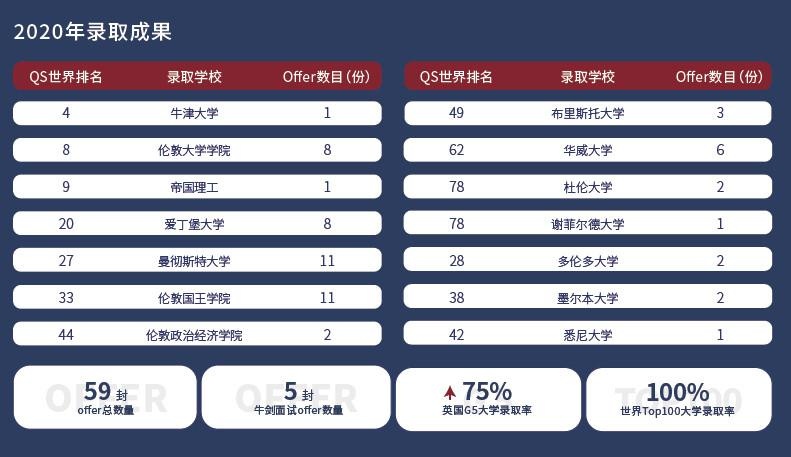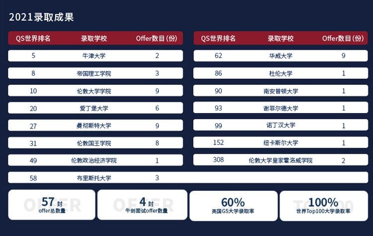 上海科桥教育教学团队多年以来成功培养众多学生进入世界名校,英国G5名校录取人数也是逐年增加。截至2021年6月23日,科桥教育2018-2021年共收获148份录取offer,其中英国G5大学录取率达60%以上,接近100%的学生被TOP100大学录取,其中包括5封牛剑面试offer,3个牛津录取offer。