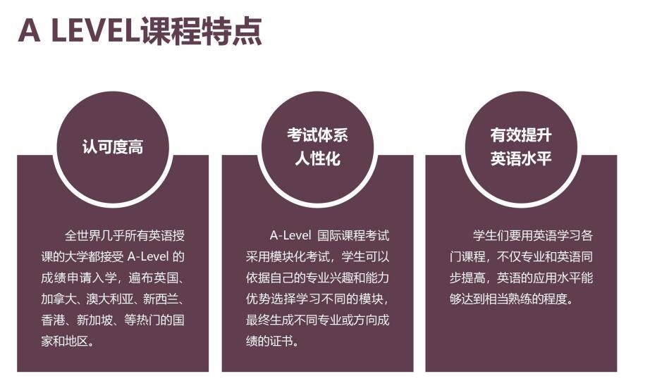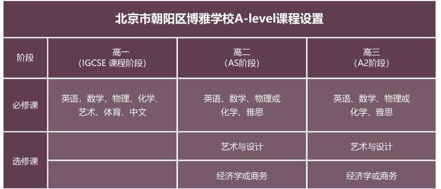 北京市朝阳区博雅学校引入国际三大课程体系之一的A-level 课程,它是英国的普通(高中)教育高级水平课程,是英国的全民课程体系,通常被称为英国的教育体系(British Global Education System)。学生根据教学计划安排再择参加A-level考试、根据成绩首选申请英国及英联邦国家的知名大学。英国高中课程(A-Level) 的学制为两年:年称为AS水准,学生通常选择自己最擅长且最有兴趣的3- 4 门课,通过考试后获得AS证书第二年称为A2水准,学生可选择AS水准中优秀的3门课继续学习,通过考试后获得A-Level证书。