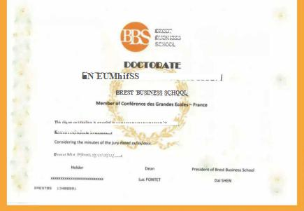 学生被录取后将在法国布雷斯特商学院建立学生档案,学生的学习课程及成绩将存入档案,修满学分并通过论文答辩后将颁发全球通用的工商管理博士(DBA)学位证书。
