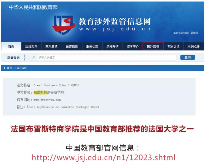 ♦ 中国国家教育部官方机构“教育涉外监管网”法国国家教育、高等教育暨研究部公布承认的法国大学 ,法国布雷斯特商学院(BBS )为中国教育部推荐的法国高等商学院,受中国教育部教育涉外监管信息网认证,其颁发的证书国际认可