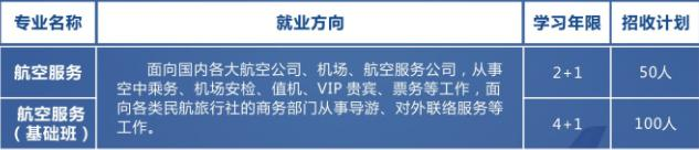(1)航空服务( 2+1) :面向全国招收应、往届高中毕业生或同等学历者(含已通过高中会考者,职高、中专、艺校毕业生),年龄17-21周岁。热爱祖国,遵纪守法,举止端庄,兴趣高雅,有志于从事航空服务事业,具有较强的服务意识和良好的道德品质。