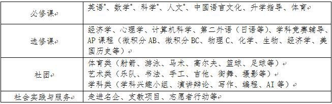 注:带*号的必修课程分层或分科目开展,同学在学校指导下根据学术基础、学术兴趣和升学目标选课。比如数学包括几何、代数2、直到AP微积分BC等,总共有6个层次可选;科学包括物理、化学、生物及相应的AP课程可选。