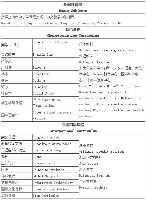 中西合璧:学校为学生设计了中西合璧的人文课程;指向未来的科学课程;陶冶心灵的艺术课程;创新实践的社会课程;强身健体的健康课程。