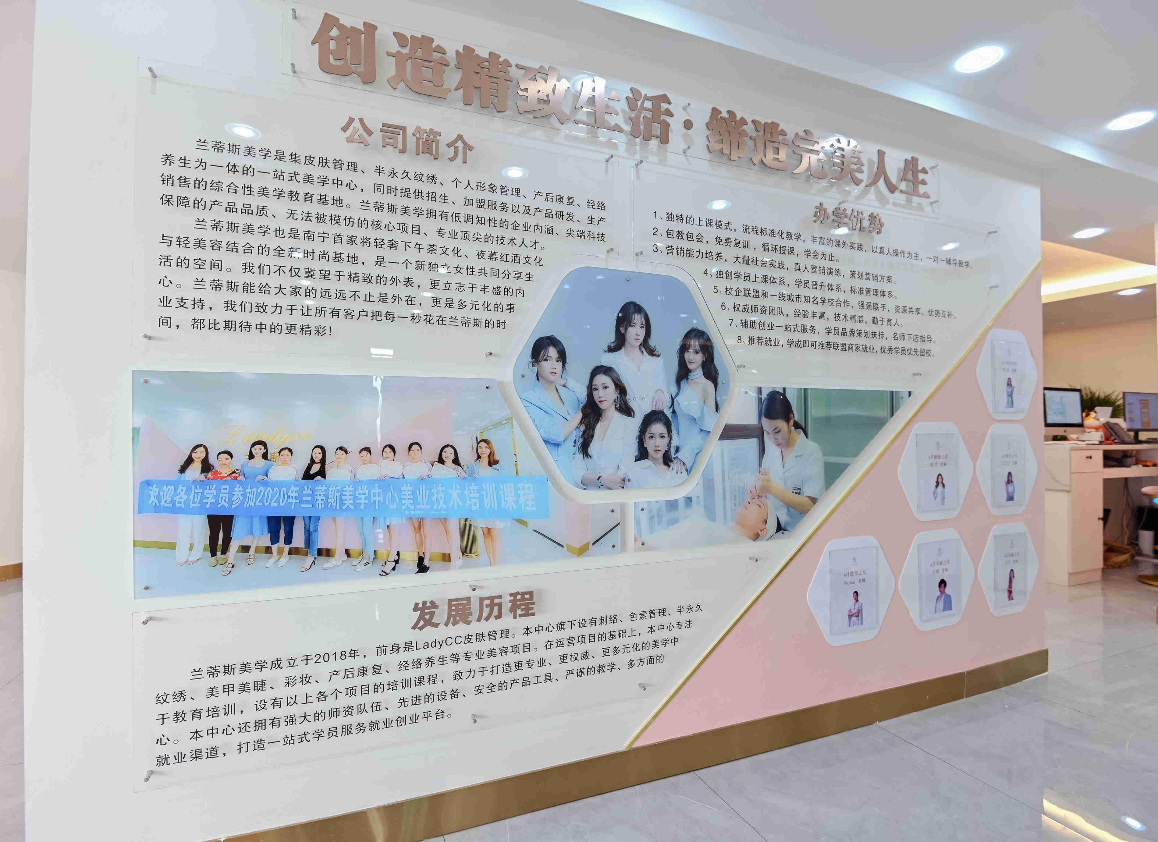 招生简章在线报名 南宁兰蒂斯美学 兰蒂斯职业技能培训学校位于繁华的东盟商务区,坐落 于会展航洋城 B 座。学校旗下还设有商学院与美业品牌连锁 门店两大板块,现已有专属门店 11 家,未来预增加盟店 100 家,努力打造美业人才输入与输出的闭环基地。学校还专为 女性打造提升自我、提高自主收入的创业平台,为女性量身 制定创业方案,提供系统化创业课程和商站实操。学校还将 依托女性自有培训体系与行业外部资源,进一步发挥女 性在企业、创业发展中的作用,增强团队职业素养、促进团 队提升、推动家庭和谐,深层次打造出兰蒂斯女性“坚韧、 顽强、自信、奋进”的精神面貌。
