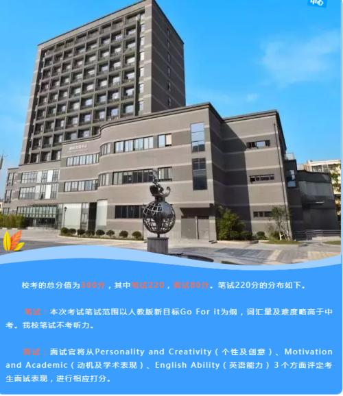 杭四中国际部将于2019年5月11日(周六)9:00-11:00(笔试),13:00-15:30(面试)举行2019级招生英语水平考试。今年我校英语水平考试成绩与中考成绩比重为5:5。