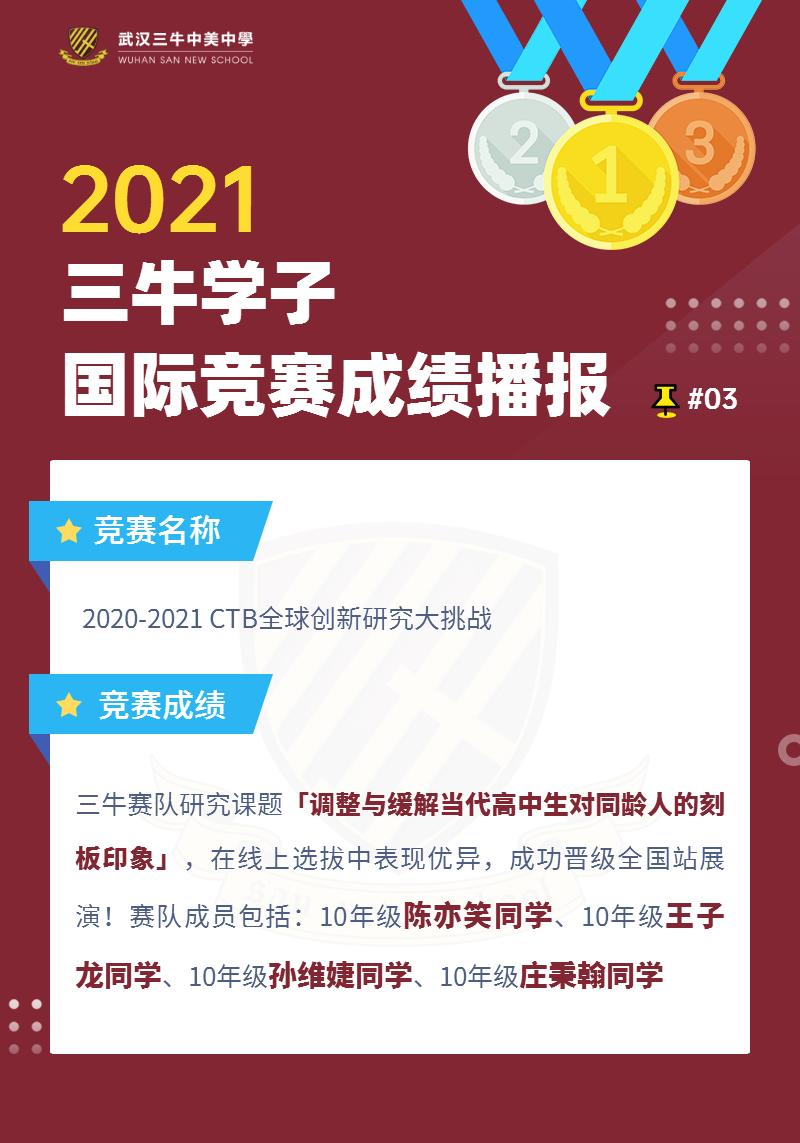 我校四位同学组成的赛队“RACEX”,凭借出众的课题实力与实践能力,从初赛1500多支海内外队伍中脱颖而出,成功晋级CTB线上全国站展演。他们提交的研究课题为「调整与缓解当代高中生对同龄人的刻板印象」,希望通过关注高中生间的刻板印象现象及产生原因,利用系列实践活动,减轻自己对他人的刻板印象,为那些正在遭受他人异样眼光的同学,带来实质性帮助。