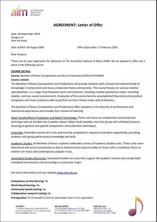 “叶泓睿现已被澳大利亚音乐学院、音乐编曲和音乐制作专业,录取。”