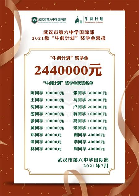 经过层层选拔和严格考核,今年共有十多名新生入选武汉六中国际部“牛剑计划”。同学们以优异的学业成绩和综合能力获得共计2440000元奖学金,其中,较高获得奖学金金额为300000元。