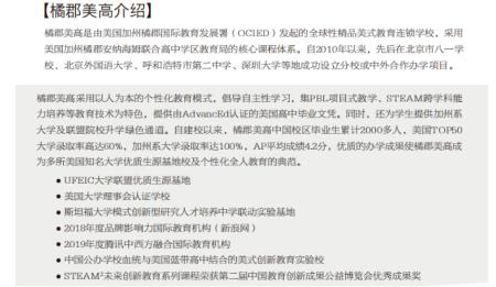 橘郡美高是由美国加州橘郡国际教育发展署(OCIED)发起的全球性精品美式教育连锁学校,采用美国加州橘郡安纳海姆联合高中学区教育局的美国蓝带学校核心课程体系,并开设多门AP课程。自2010年以来,先后在北京市八一学校、北京外国语大学、呼和浩特市第二中学、深圳大学、中国煤矿文工团艺术等地成功设立分校。