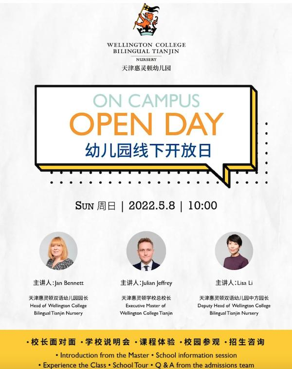 欢迎您于5月8日,周日,上午10:00莅临天津惠灵顿幼儿园探园体验活动,与我们的教师团队面对面交流,了解更多相关内容。