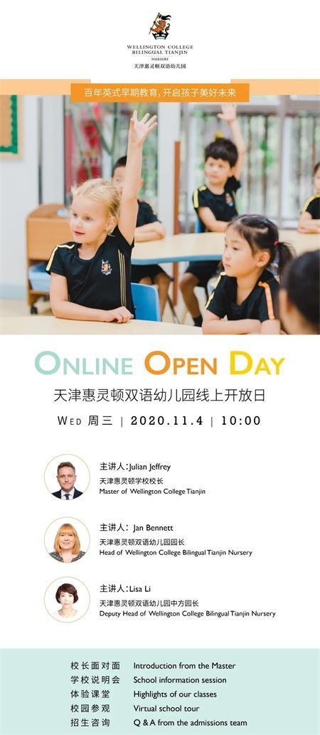 我们诚邀您于11月4日,周三,上午10:00与我们相约直播间,跟随园长的脚步,一起探索天津惠灵顿双语幼儿园的独特魅力,深度了解这里的教学理念、学习方法。您还将认识充满激情的优秀教师团队,感受惠灵顿双语幼儿园孩子的一天。