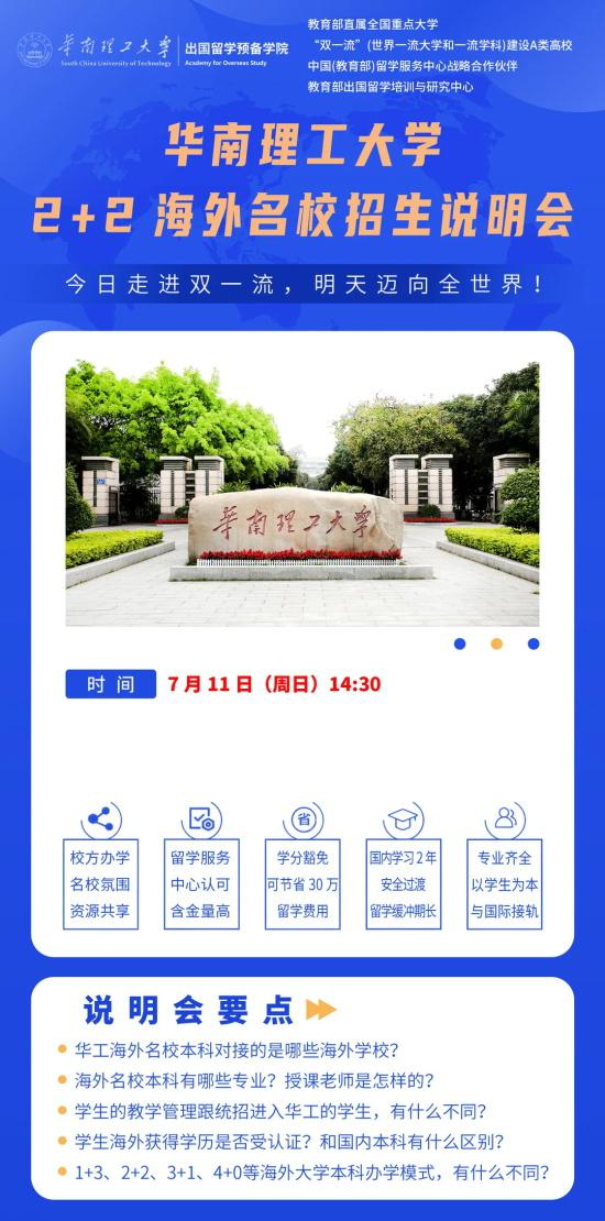为了让广大优秀学子获得国内外高校的双重教育体验,7月11日(本周日)下午2点半,华南理工大学出国留学预备学院将举办2+2海外高校本科线下招生说明会,安排免费入学考试,限额录取。