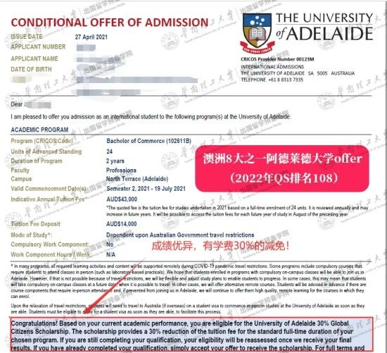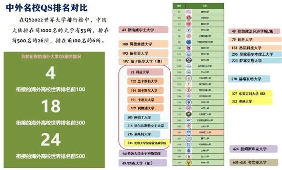 我国的人口基数大,高中毕业生要上国内的“211 ”、“985” 高校,无异于千军万马过独木桥。与此形成鲜明对照的是,海外大学的学位是充裕的。近几年,在华南理工大学出国留学预备学院学习的学生获得了海外大学录取,2021本项目出国学生当中,30%的学生升读了QS世界大学排名前200的大学。65%的学生升读了QS世界大学排名前300的大学。90%的学生升读了QS世界大学排名前600的大学。