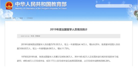 2019年度,我国出国留学人员总数为70.35万人,较上一年度增加4.14万人,增长6.25%;各类留学回国人员总数为58.03万人,较上一年度增加6.09万人,增长11.73%。