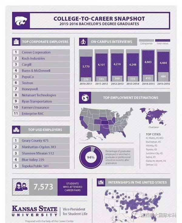 谈到堪萨斯州立大学毕业生就业的具体情况,Keller介绍到有94%的学生会在毕业六个月至一年后成功就业或是继续修读硕士、博士等学位。根据近几年的统计,有70%的本科毕业生在堪萨斯州和密苏里州成功就职,但随着目前就业地点的多元化,有越来越多的毕业生选择就职于德克萨斯州、科罗拉多州、俄克拉荷马州、加州、伊利诺伊州等全美一线大州。