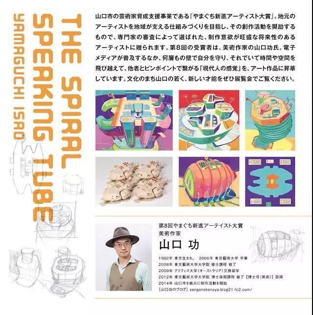 山口先生出生于东京,2012年东京艺术大学博士生毕业,日本第8艺术家大奖获奖者。他的作品常思考人与外部环境的关系,作品已在50次个展及团展中展出。他一直以山口市为创作据点,通过在这个城市的生活感触,将情感注入创意里,通过作品呈现当下的所思所想。 他的创造力旺盛、风格奇特,作品中常常出现各种神奇的非地球生物。