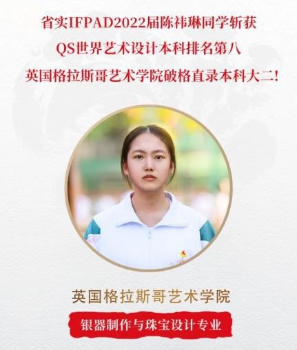2022录取放榜正在如火如荼地进行中!这周,省实IFPAD国际艺术高中部再添一枚英国格拉斯哥艺术学院(GSA)本科直录Offer,值得一提的是由于Irene成绩优异,各项表现突出,被GSA破格直录本科大二!
