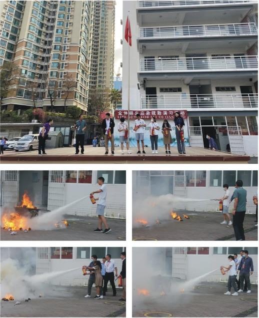 模拟灭火环节,学校义务消防队进行了现场模拟灭火演练,学生代表及教职工代表亲自操作使用灭火器模拟扑救初期火灾。
