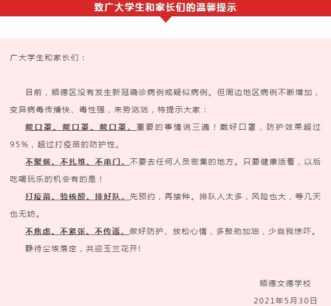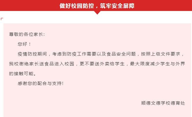 为保障校园安全和师生生命健康安全,根据上级关于进一步做好疫情防控工作的通知和有关要求,顺德文德学校周密部署,持续做好每天防疫工作,敬请各位家长认真阅读以下材料。
