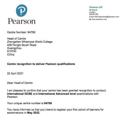 中黄书院 Zhongshan Whampoa World College于2021年4月25日顺利获得爱德思(EDEXCEL)考试局的授权认证,考试中心编号:94769。