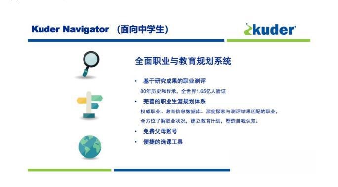 Kuder作为全球领先的职业指导解决方案提供方,Kuder Navigator是由多名在职业指导领域屡获殊荣的著名专家所设计,是一站式的在线教育与职业规划系统。自1938年至今,Kuder系统已经过了全球1.65亿人的验证。