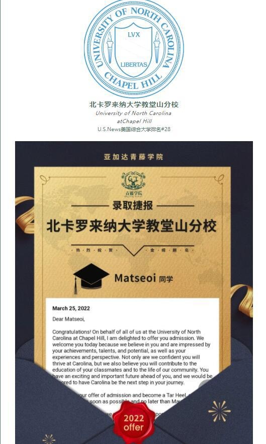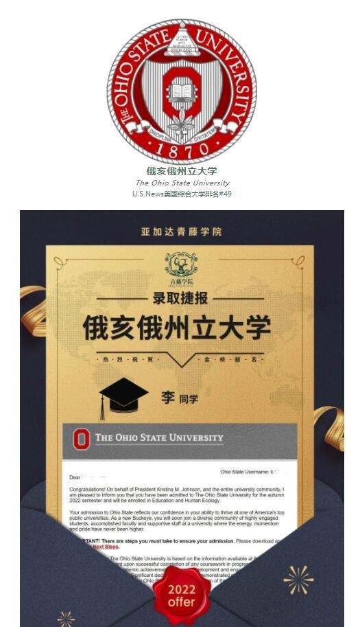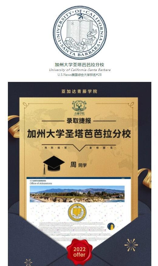 近日,青藤学子再添4枚世界名校录取,其中2枚全美TOP30和1枚全美TOP50录取,包括北卡罗来纳大学教堂山分校(U.S.News综合排名#28)1枚、加州大学圣塔芭芭拉分校(U.S.News综合排名#28)1枚、俄亥俄州立大学(U.S.News综合排名#49)1枚、宾夕法尼亚州立大学(U.S.News综合排名#63)1枚。