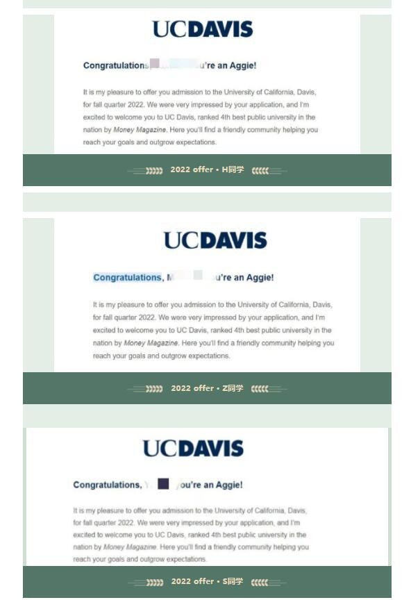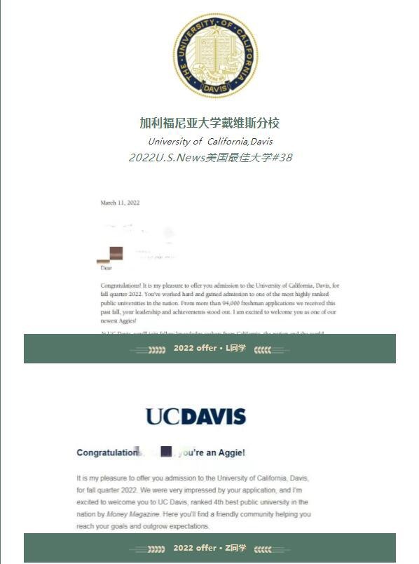 热烈祝贺亚加达青藤学院5名学子斩获世界名校加利福尼亚大学戴维斯分校(2022U.S News美国大学排名#38)录取通知书。