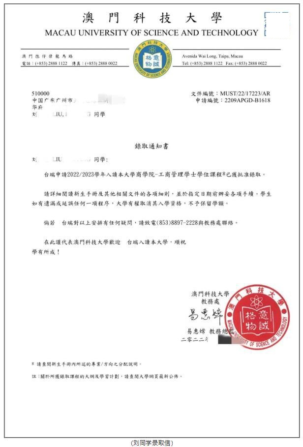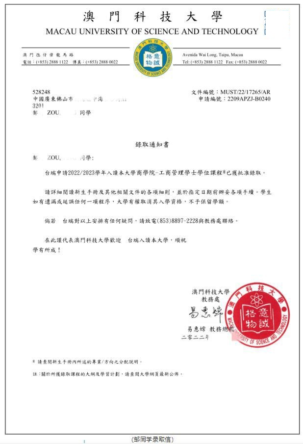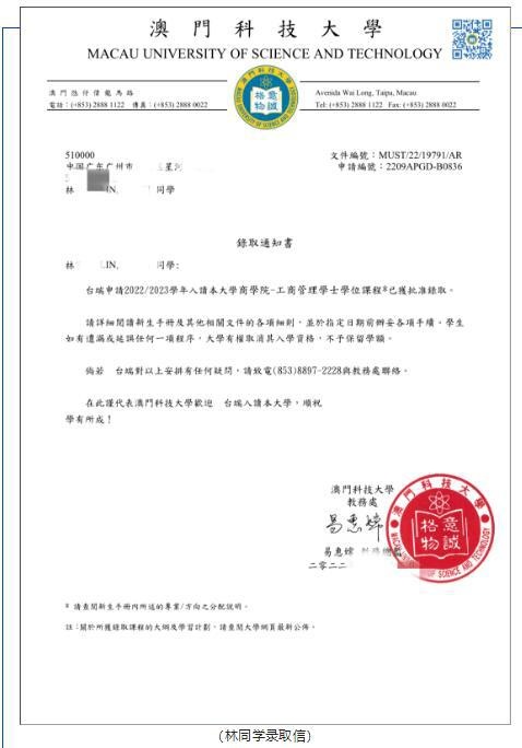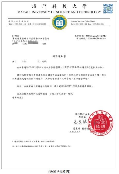 截至今日,广东侨中国际2022届学子已斩获澳门科技大学的录取4枚!