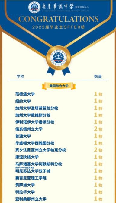 近期,广东华侨中学国际部学子陆续收到了众多offer喜讯。截至3月31日,我校2022届23位毕业生共收到来自美国、英国、加拿大、澳大利亚地区共61份录取通知, 合计获得228813美元奖学金。