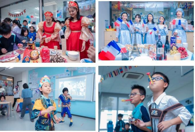 回到家长们忧心的问题,“家长们忧心的问题,”是的。在深圳诺德安达双语,几乎每个月都有2-3场学校活动,开放给家长一起参加。上个月刚结束的国际日活动,学生们以班级为单位,组织了近 30 个不同的“小国家”,举办了一场国际文化交流盛宴。国家不同的语言、服饰、食物、建筑、传统习俗等,这不是不同的学习领域吗?