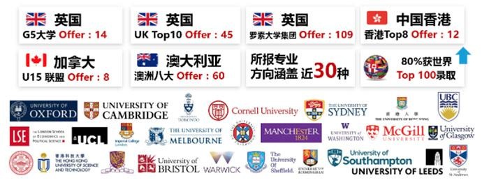 截至目前,美伦国际教育UK及BC学部2022届毕业生共收到英国G5大学含帝国理工学院、伦敦大学学院等Offer14份,英国排名Top10大学Offer45份,英国罗素大学集团成员大学Offer109份,中国香港地区Top8含香港大学、香港中文大学、香港城市大学、香港理工大学等Offer共12份,加拿大U15联盟含多伦多大学、英属哥伦比亚大学、麦克马斯特大学等Offer8份,美国华盛顿大学、东北大学、加州大学圣克鲁兹分校、加州州立大学洛杉矶分校等Offer6份,澳大利亚8大含悉尼大学、墨尔本大学、新南威尔士大学等Offer60份。