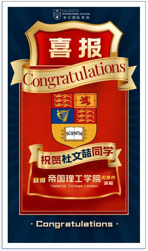 美伦国际教育又喜获G5超级精英大学之一、同时也是英国学术最严格大学之一的帝国理工大学的录取!并且,杜文喆同学收到了帝国理工无条件录取的offer!帝国理工的青睐继续花落美伦!