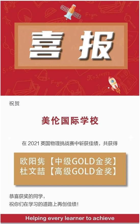 2021英国物理思维挑战(中级&高级)获奖名单新鲜出炉!此次竞赛中国赛区共有来自全国430多所国际学校和重点中学的近4000名同学参赛。来自美伦国际教育的参赛队伍取得了2金的好成绩。在此,祝贺获奖的同学!