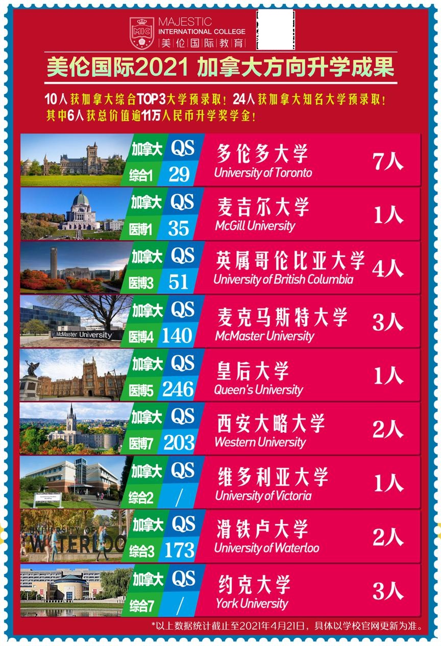 此外,美伦国际2021届准毕业生共收到各国大学预录取561份(包括3名剑桥大学预录取),其中英国321份,加拿大24份,美国18份,澳洲170份,中国香港地区27份……78%均为世界TOP100录取,90%均为TOP200录取!值得一提的是,这届美伦毕业生中有11人次获得海外8所大学发出的折合总价值超100万人民币(高达172万)奖学金!(数据截至2021年4月21日)