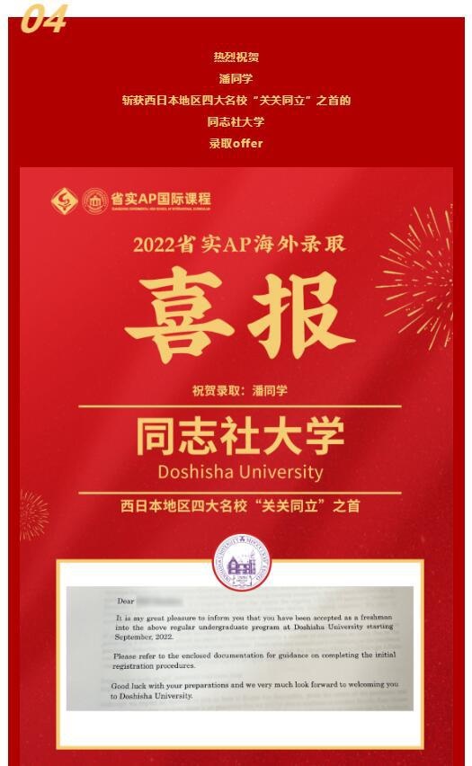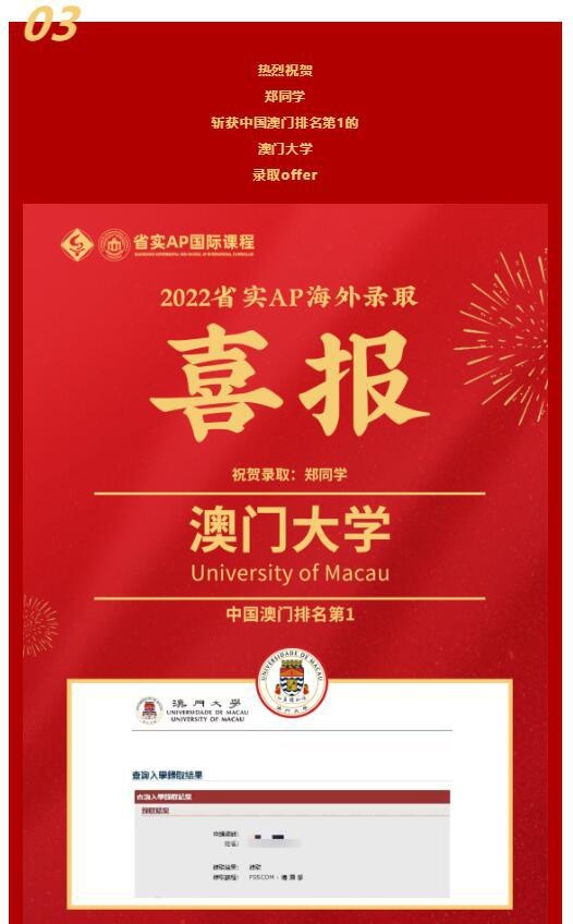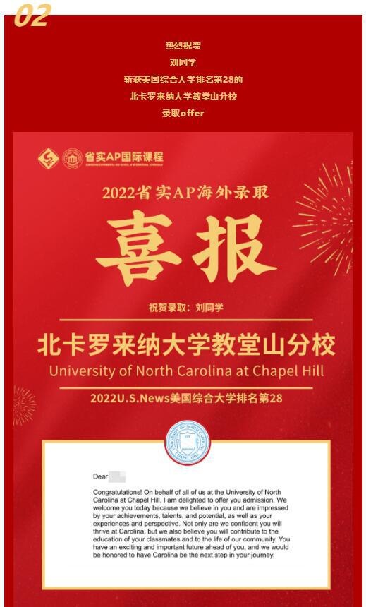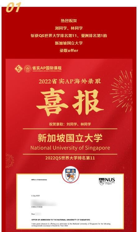 在2022申请季的末尾,仍有不少名校录取翩然而至。近日,省实AP学子们收到了2封新加坡国立大学、1封北卡罗来纳大学教堂山分校、1封澳门大学、1封日本同志社大学录取Offer。值得一提的是,今年是省实AP连续第二年获得新加坡国立大学的青睐。