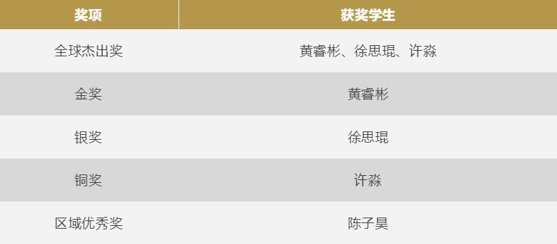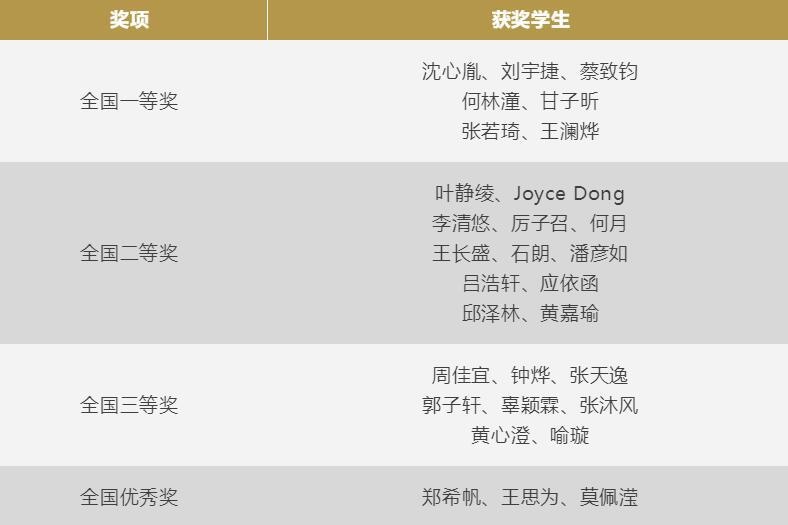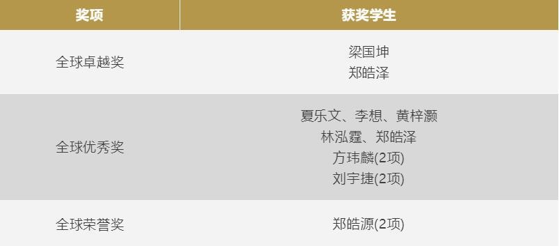 在2022年加拿大化学竞赛中,省实AP学子共获3项全球杰出奖(中国参加选手超过加拿大前10%的选手分数线获该奖),1项全国金奖,1项全国银奖,1项全国铜奖及1项区域优秀奖。