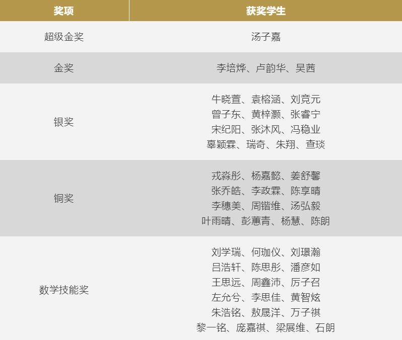 在2022年袋鼠数学竞赛中,省实AP共有1名学生进入全国排名前3%,获超级金奖;2名学生进入全国排名前5%,获金奖;13名学生获银奖,13名学生获铜奖,19名学生获数学技能奖。