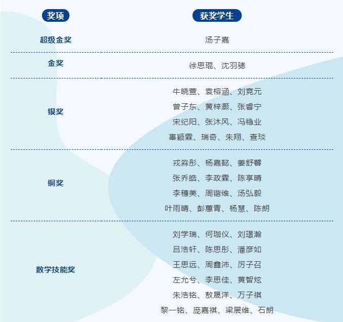 在2022年袋鼠数学竞赛中,省实AP共有1名学生进入全国排名前3%,获超级金奖;2名学生进入全国排名前5%,获金奖;13名学生获银奖,13名学生获铜奖,19名学生获数学技能奖。
