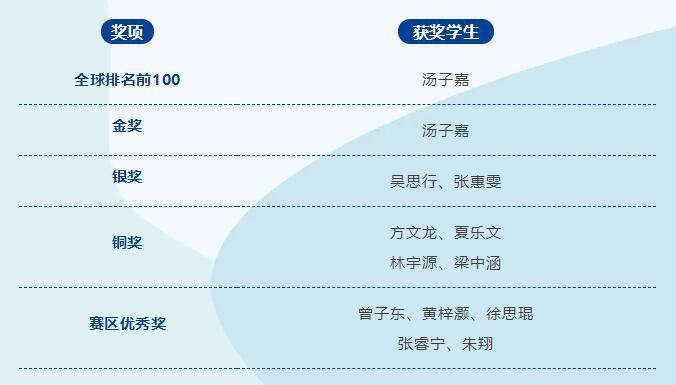 在2022年“物理杯”美国高中物理思维挑战中,省实AP学子共获1项全球排名前100,1项全国金奖,2项全国银奖,4项全国铜奖及5项赛区优秀奖。
