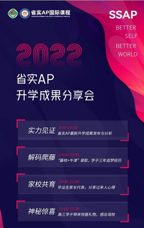 4月30日(周六),我们将线上直播“2022省实AP升学成果分享会”,全面揭晓2022年升学成绩!更深入的升学案例剖析、更走心的学生/家长分享,带您全方位了解省实AP优异成绩背后的人才培养机制。更有诚意满满的毕业生惊喜礼物,众多精彩内容,邀您共同见证!