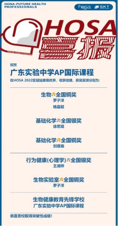 HOSA 生物与健康未来领袖挑战 2022区域站于近日圆满落幕。热烈祝贺省实AP学子在此次比赛中共获得全国银奖2项、全国铜奖3项!同时,省实AP国际课程连续第二年获得“生物健康教育先锋学校”荣誉称号!