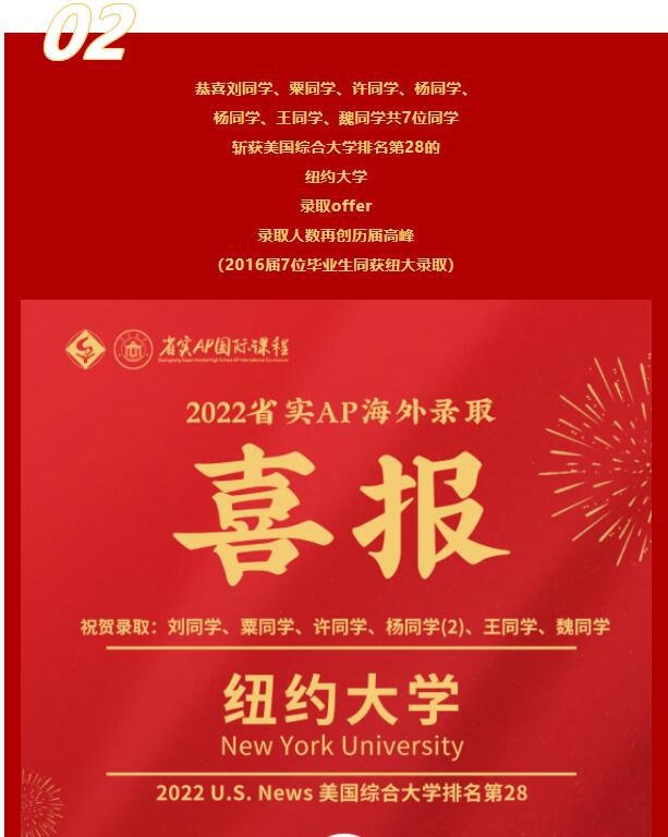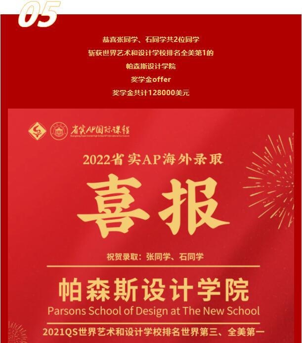 截至12月16日,2022届省实AP学子已收获多封来自世界各国的院校及王牌专业录取offer。其中,美国TOP30院校录取9封,英国TOP15院校录取5封,酒店管理学科世界TOP1院校瑞士洛桑酒店管理学院录取1封,世界艺术院校录取5封,获得奖学金共计528400美元。