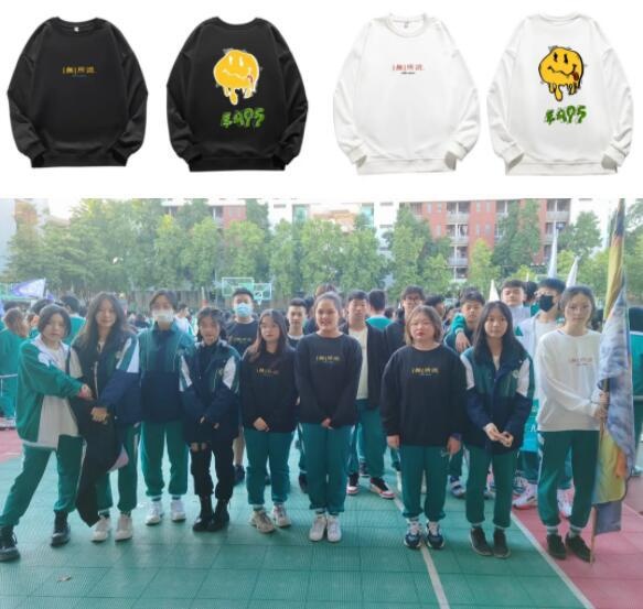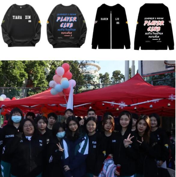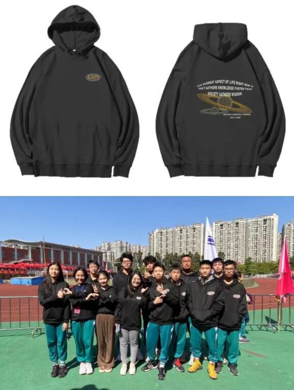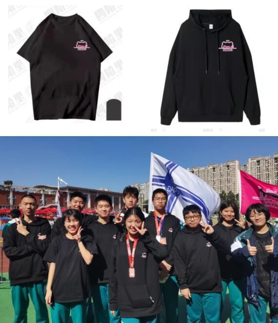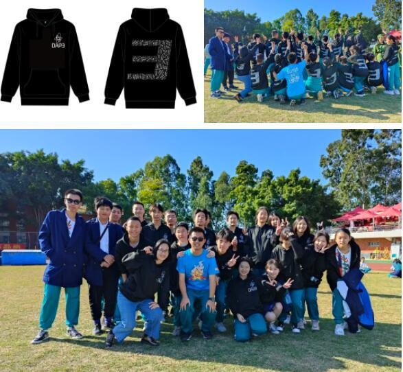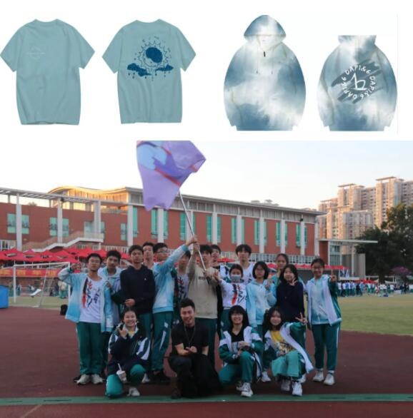 卫衣:扎染颜色取色于班服T-shirt,背后的木马图案由数字1和6组合而成,也寓意着DAP1班和6班在体育节中奔涌向前,如同汗血宝马般,取得好成绩。周围环绕着DAP1和6的文字,象征着1班和6班非常团结。