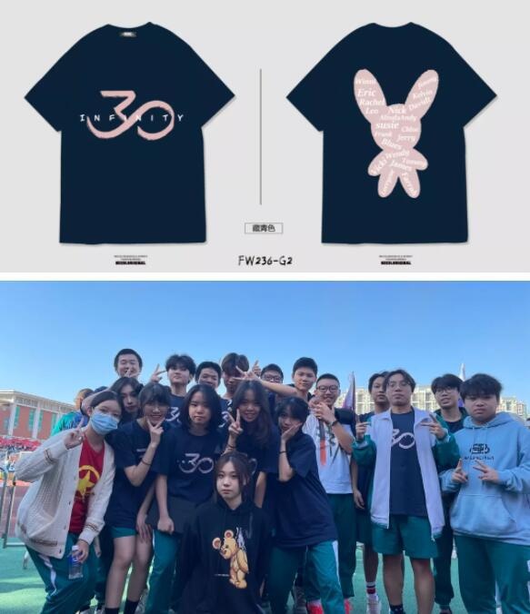 本班服以藏蓝色为底,代表稳重与智慧,班服的正面是由数字3以及一个近似无穷(∞)的符号组成,中间穿插“无限“的英文“infinity”,象征3班具有无限的可能,也寓意着我们是永远的3班,班服的背面是兔子的图案,在上面附上了班级中21位同学的英文名字,兔子具有活泼可爱的特征,这寓意着我们3班的每一位同学,都时刻洋溢着青春的朝气蓬勃以及团结奋进。
