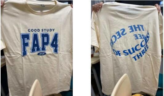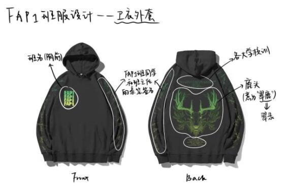 我们班服整体字体的颜色由绿色渐变为黄色,寓意由夏入秋,逐渐凉爽的天气。正面有四个FAP1,并如海浪般波动,代表我们乘风破浪,积极向前的态度。两侧的袖子上是我们班所有同学和班主任的亲手签名,既有纪念意义又寓意永远的团结。背面威武雄壮的鹿头象征我们不畏艰难,一往无前的精神,且翠色也象征“翠录”。鹿头上下是各国外知名大学的校训,表达出我们对“申请下车”的强烈期望和信心。